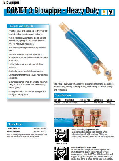 The COMET 3 blowpipe, when used with appropriate attachments, is suitable for fusion welding, braze welding, brazing, soldering, heating, hand cutting, sheet metal cutting, rivet cutting, powder facing and flame cleaning.