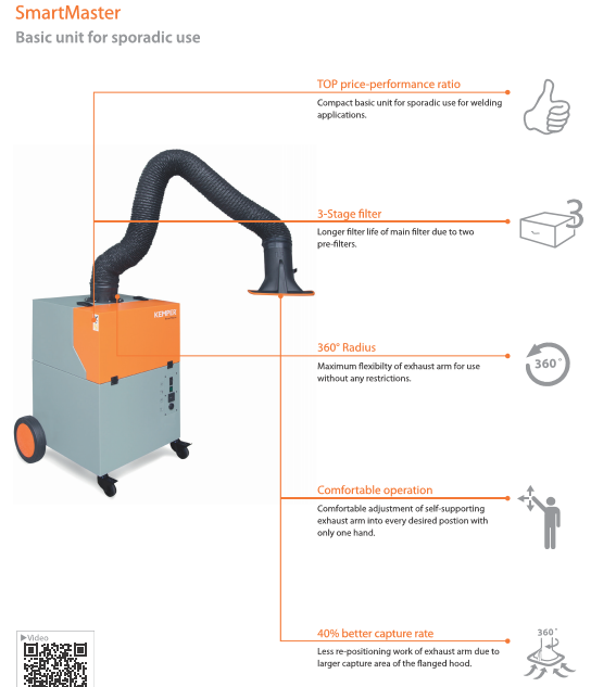 The basic mobile welding smoke extraction unit is designed for occasional use with low amounts of dust. The rotating and swiveling exhaust hood enables use in a 360-degree radius and ensures only few adjustments during welding. The basic device is suitable for welding high alloy steel due to its W3 approval.