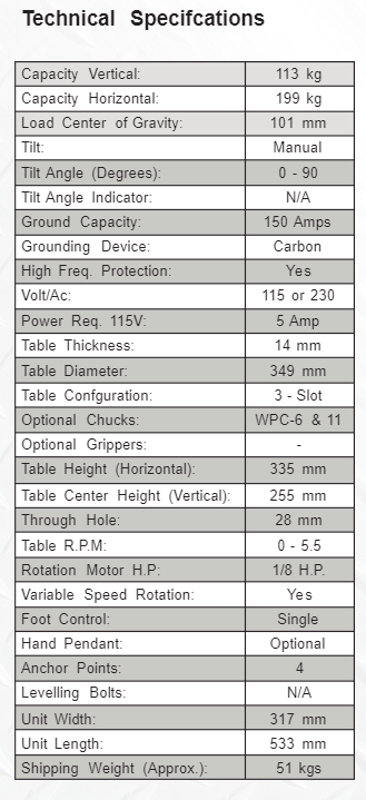Designed for rotation of lighter work pieces. Will hold 200kgs. in the horizontal position and 113kgs. in the vertical position.
