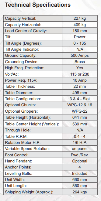 Designed for rotation of lighter pieces of up to 400 kgs in the horizontal position and 227 kgs in the vertical position